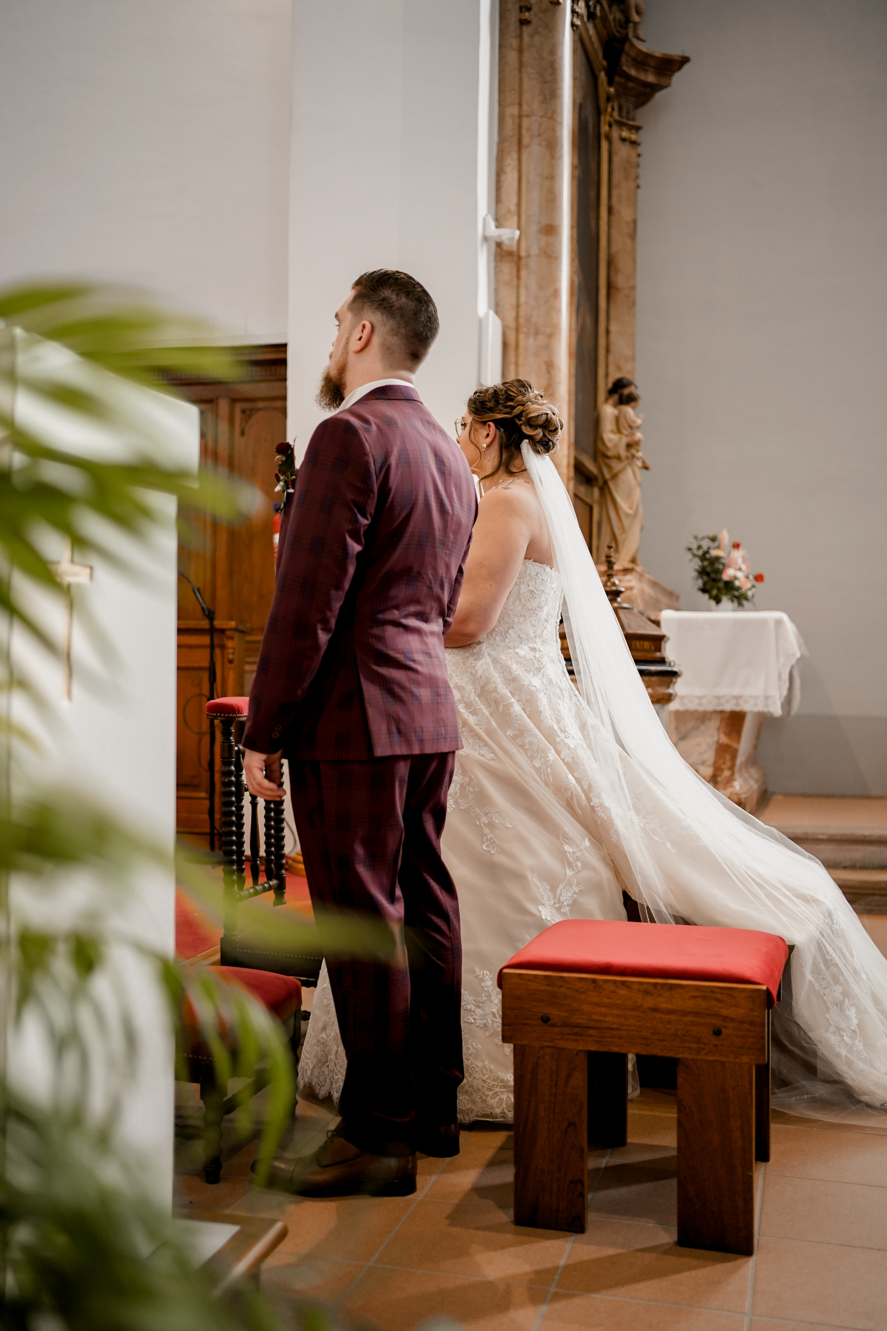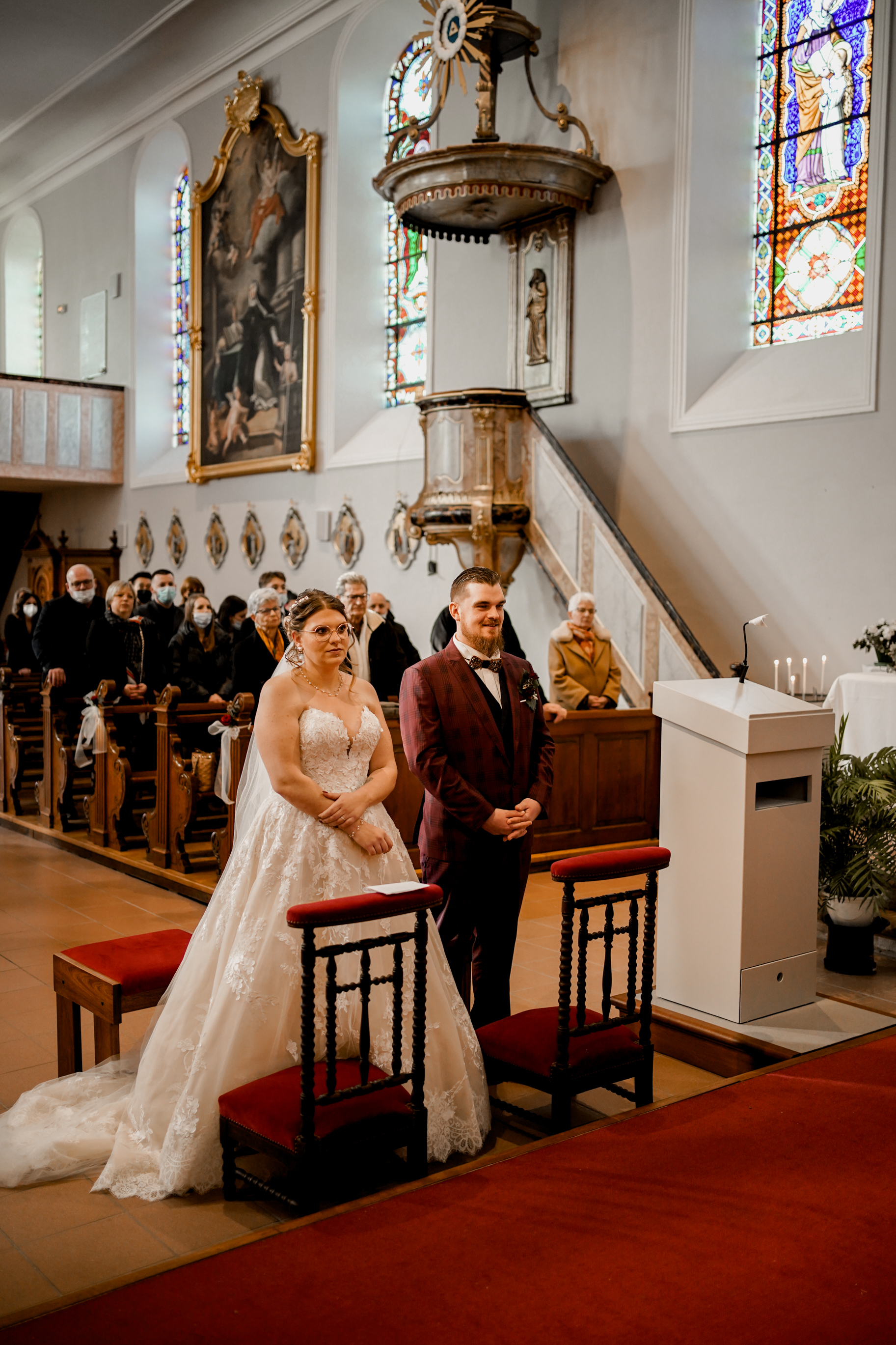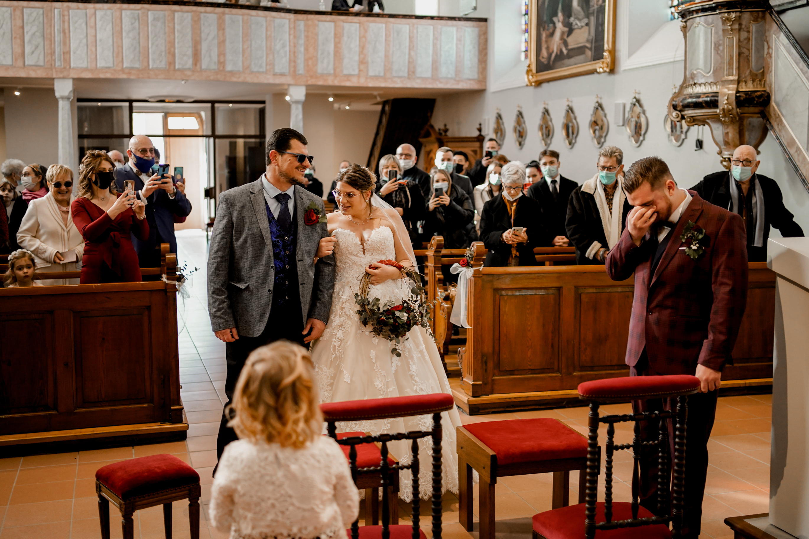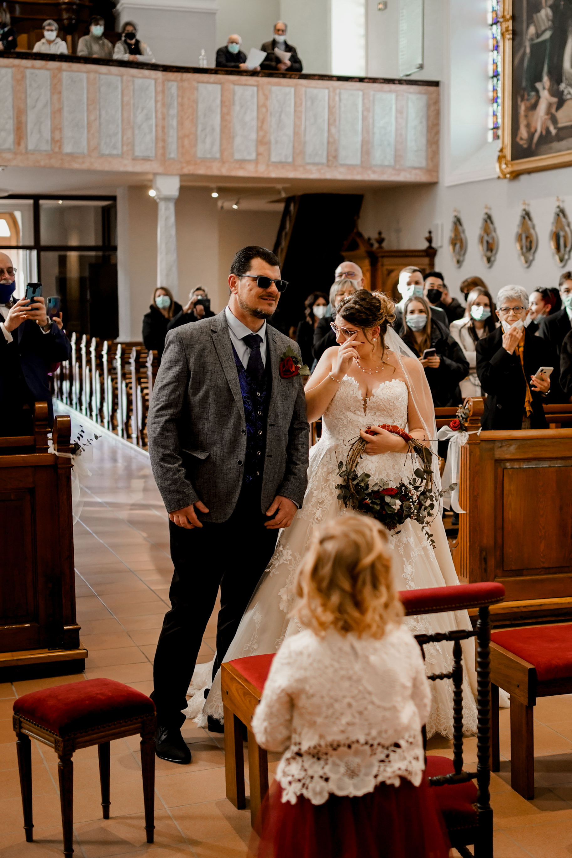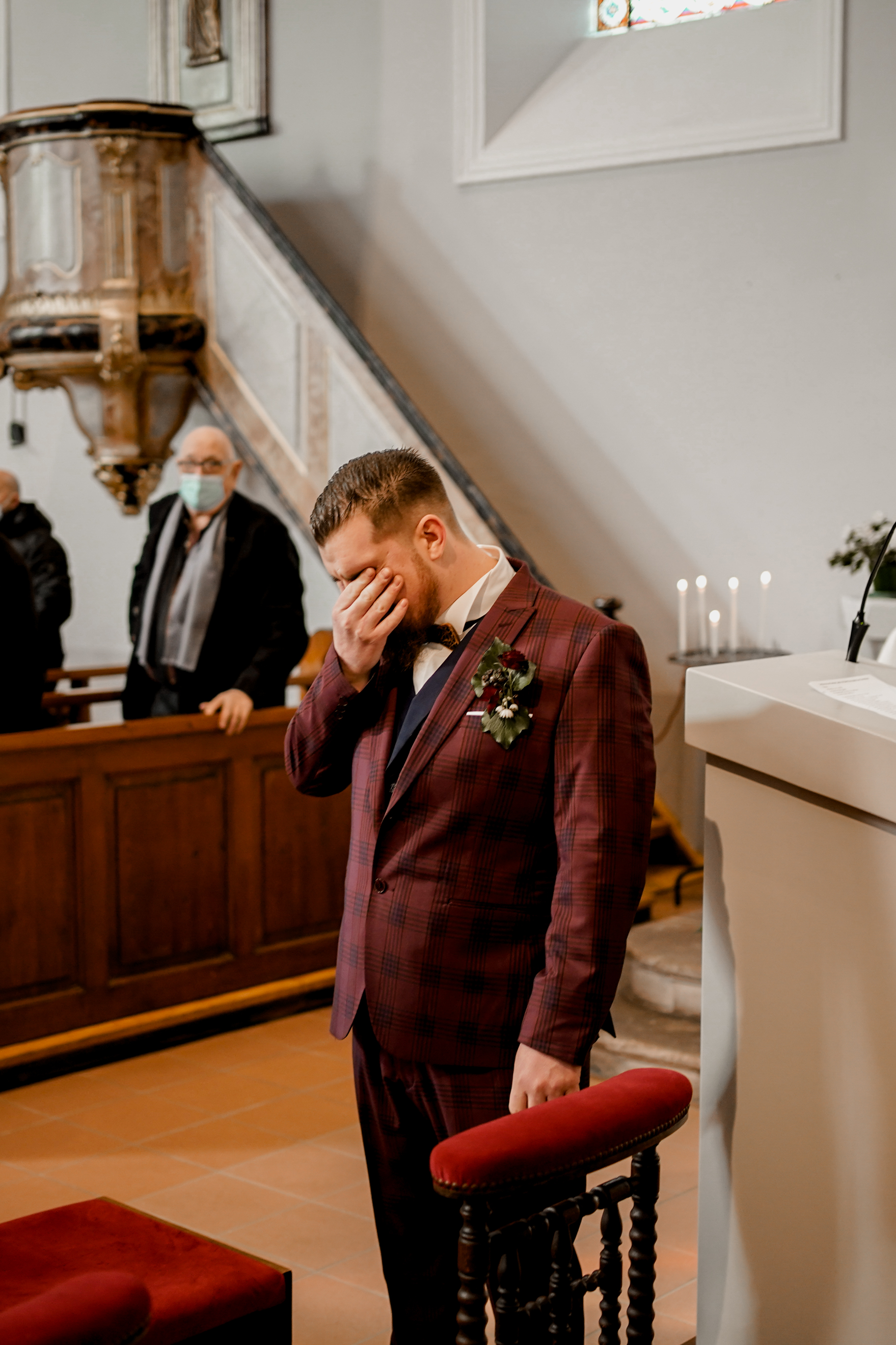 Cet instant « pomponnage » passé, il était temps pour moi de retrouver Joris devant l’église en attendant l’arrivée de la belle mariée. Margaux n’est apparue, aux yeux de tous, qu’à l’intérieur de l’église. Lorsque Joris l’a découverte, l’émotion était au rendez-vous ! J’adore capturer ce genre de moment.