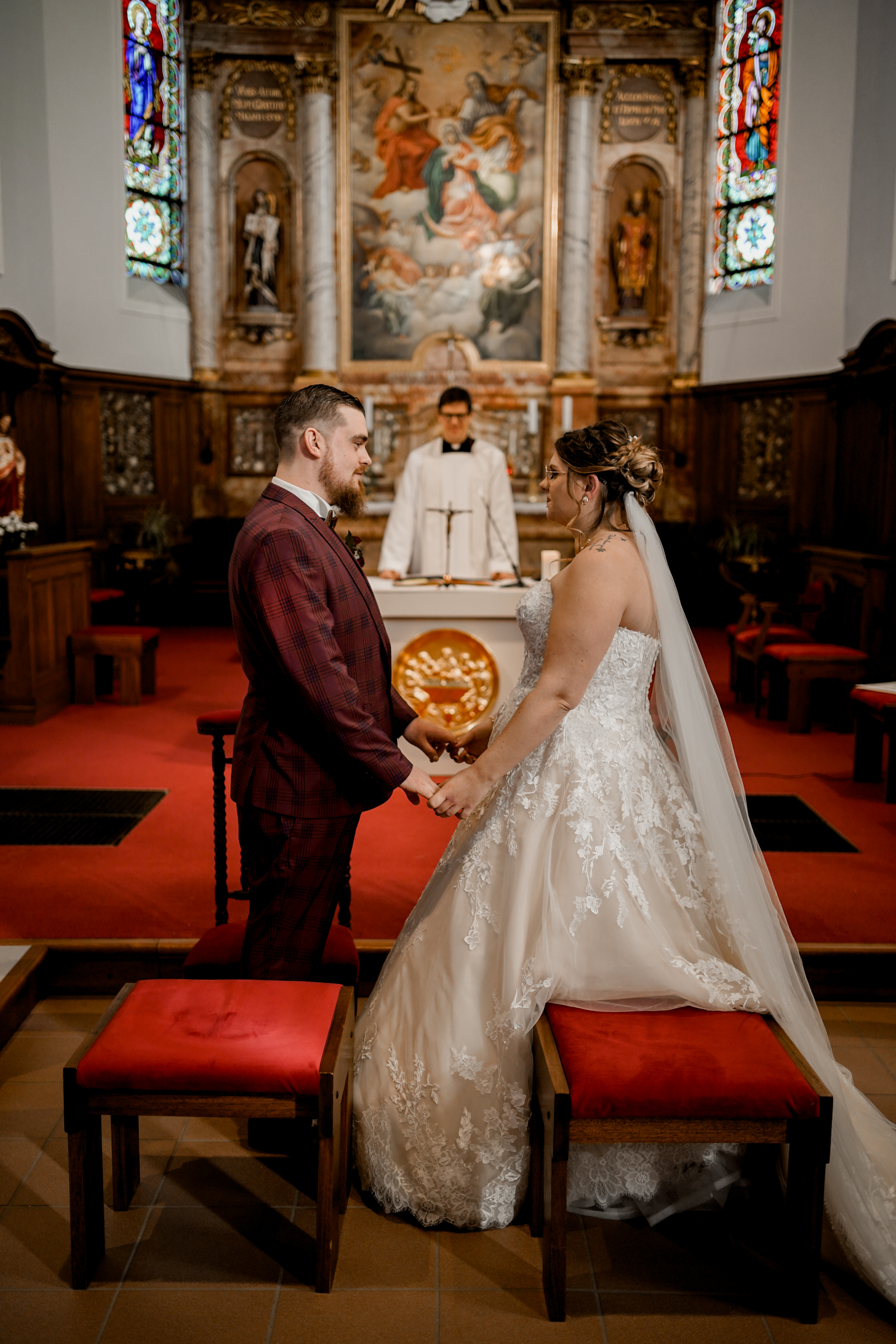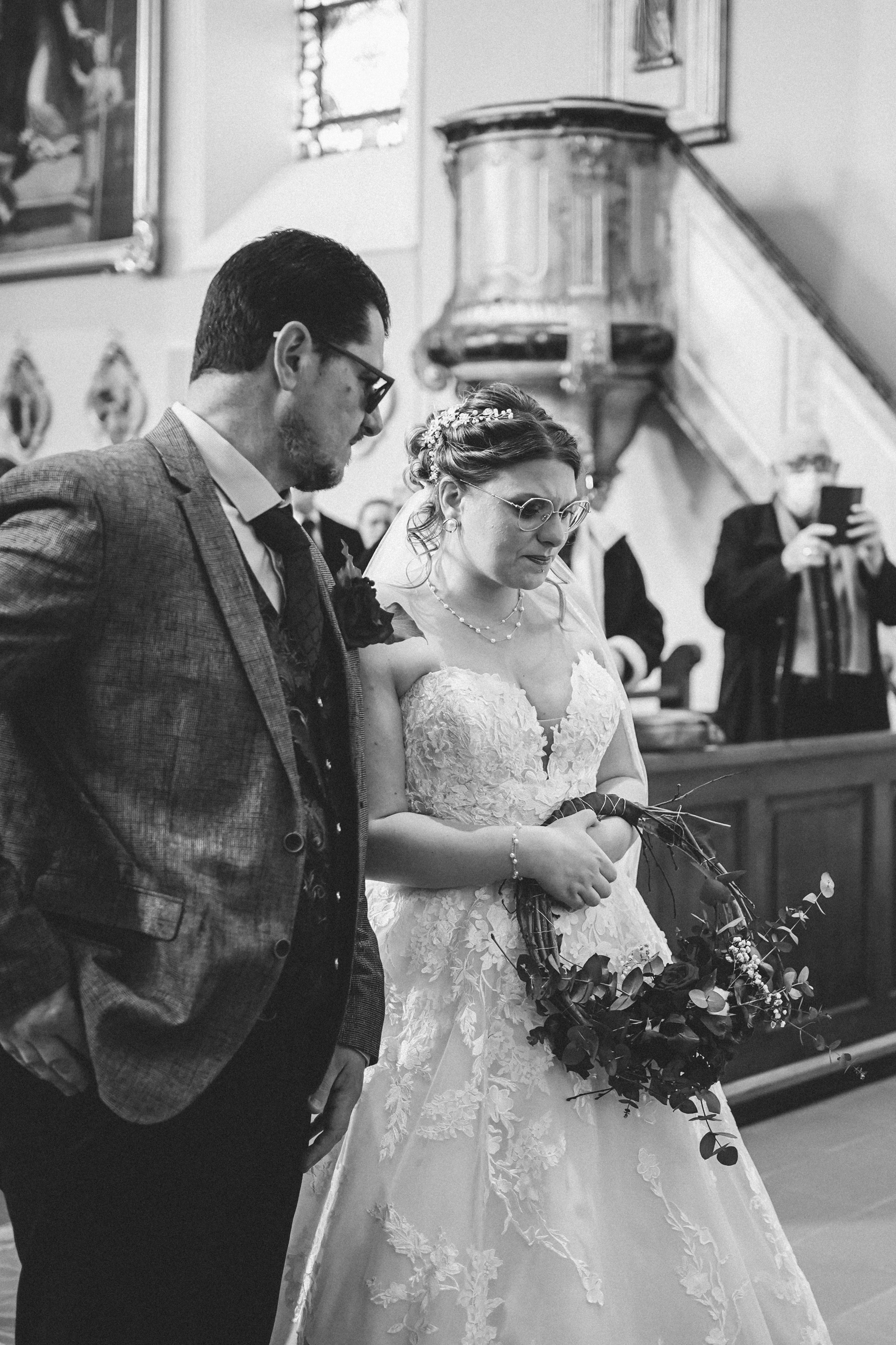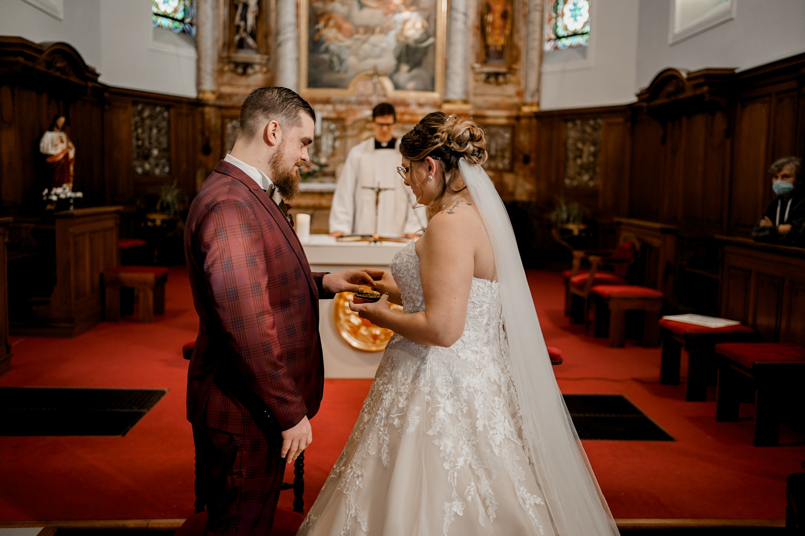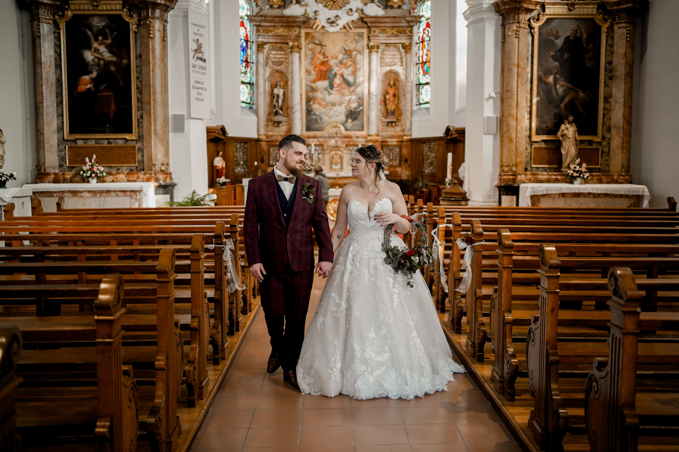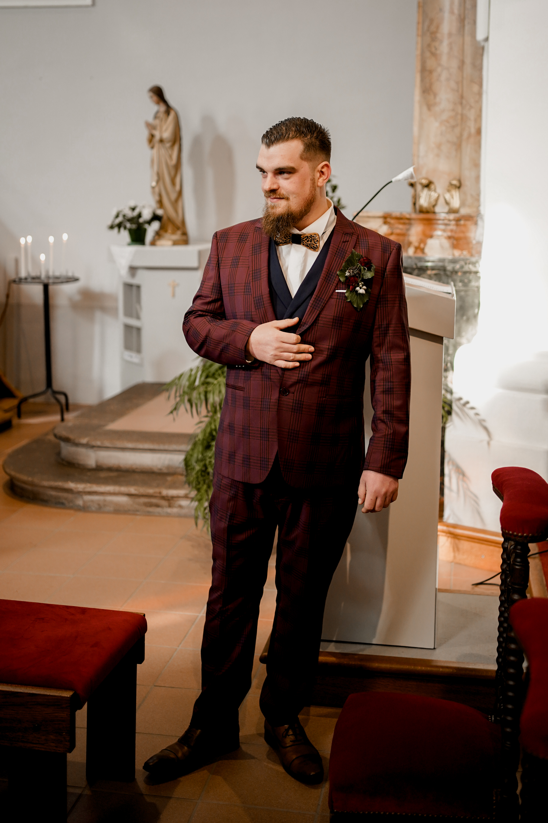 Cet instant « pomponnage » passé, il était temps pour moi de retrouver Joris devant l’église en attendant l’arrivée de la belle mariée. Margaux n’est apparue, aux yeux de tous, qu’à l’intérieur de l’église. Lorsque Joris l’a découverte, l’émotion était au rendez-vous ! J’adore capturer ce genre de moment.